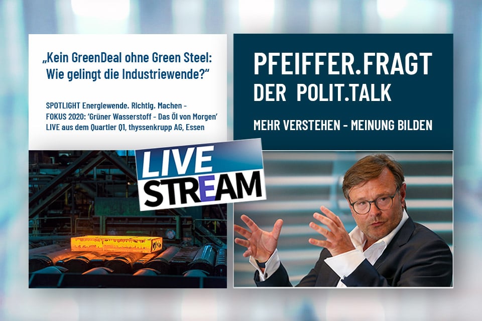 Die Milliardenschweren Post-Corona-Investitionen aus Brüssel, der Umbau der Stahlindustrie und die Rolle, die Grüner Wasserstoff dabei spielen kann: Diese Themen stehen im Fokus der neuen Folge des Polit.Talks PFEIFFER FRAGT – live aus dem Quartier 1 von thyssenkrupp in Essen.
